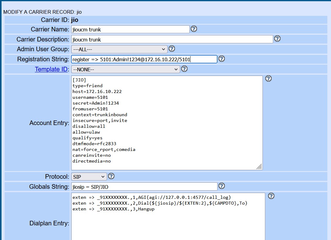 VICIdial | SIP Trunk (JIO) | Connects to UCM using extension credentials |