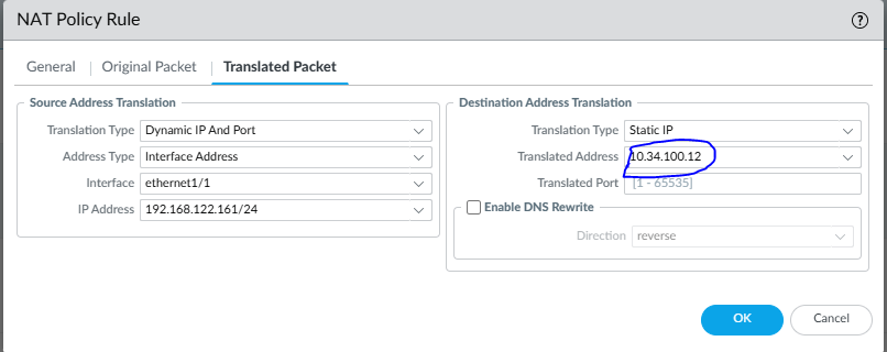 192.168.122.172→10.34.100.12 - Source IP translated to firewall WAN interface IP
